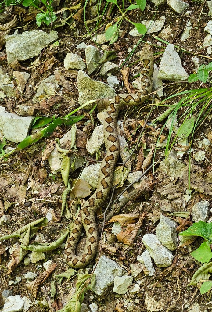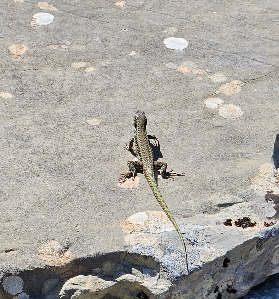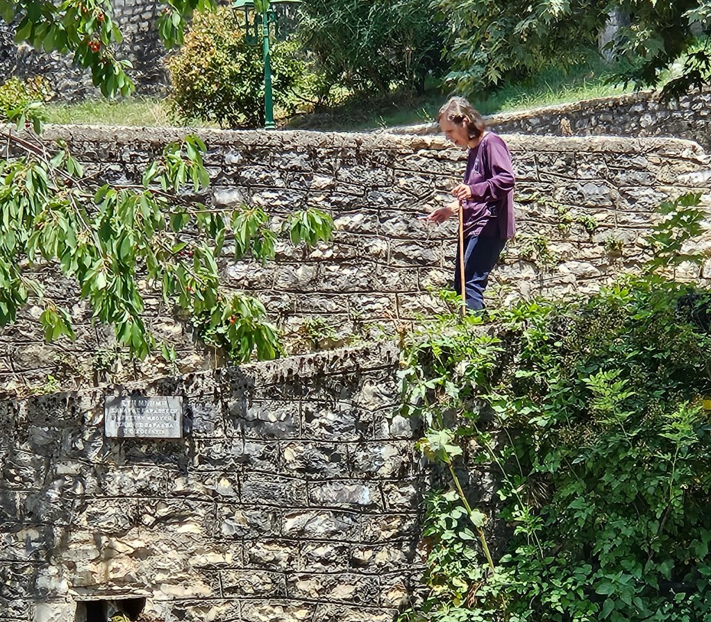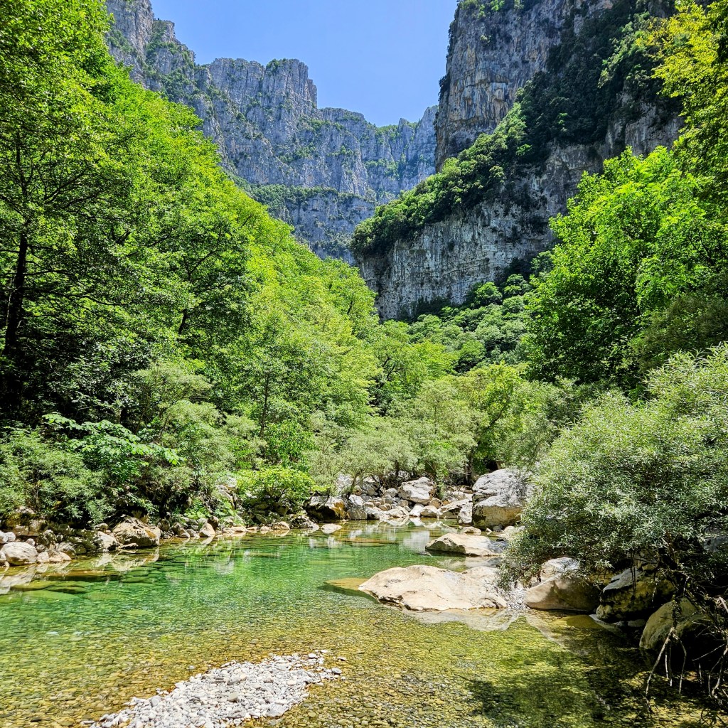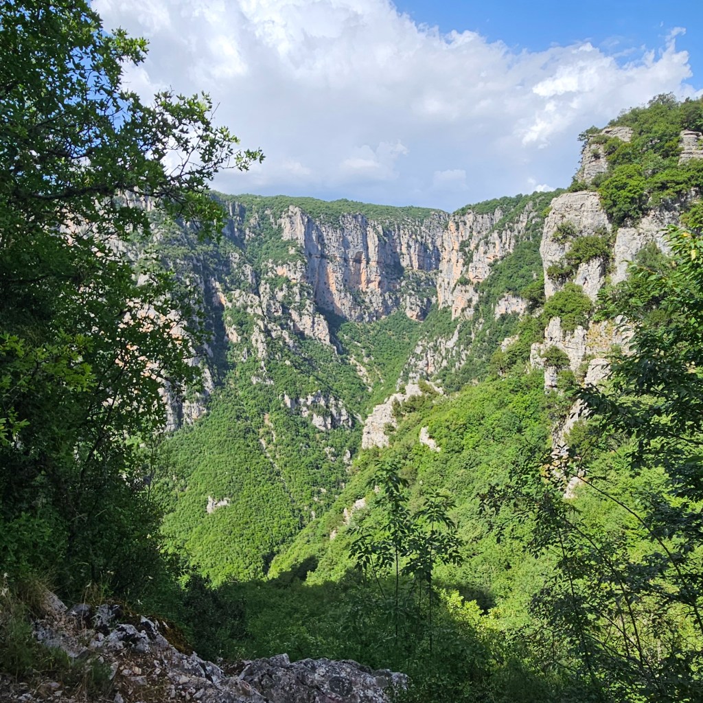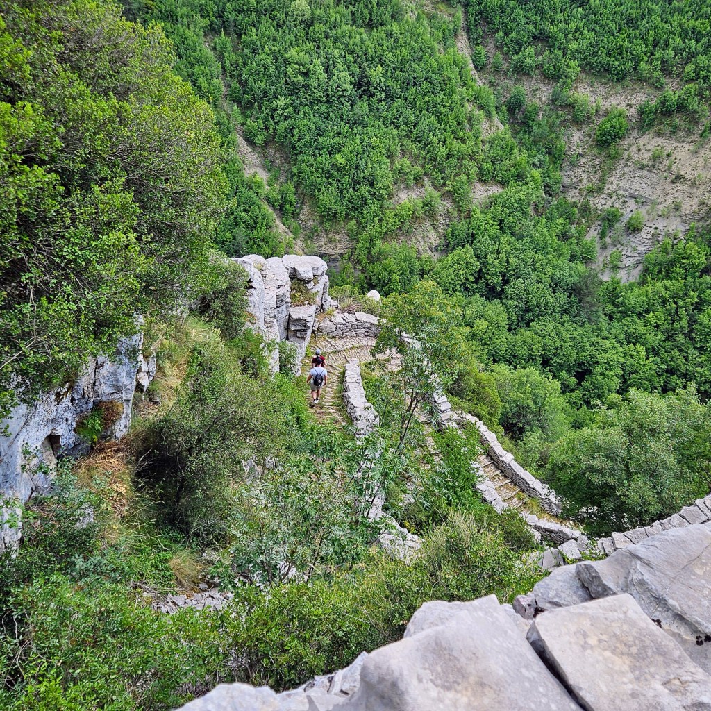 The primary attraction here is Vikos Gorge, which claims to be the deepest chasm on earth as a function of depth to width. And it’s certainly impressive although not terribly long. Most of it can be hiked in a single long day. The typical route is from Monodendri, the village where I’m staying, which seems to be the main base in this part of Zagoria, with several hotels, restaurants, and even an ATM, the first I’ve seen since Athens. The hotel manager, who also runs the main taxi service, suggested I start in Vikos, which is where most people end their hike as it’s mostly downhill from Monoderdri. And while the reverse is mostly uphill, especially the grueling climb out of the canyon, the views are better and it’s easier on the knees. Not sure how he knew, maybe it’s the white hair and knee brace? Regardless it was probably the best advice. The taxi dropped me at Vikos under a light sprinkle which while a welcome relief from the heat made the stone path rather slippery, and of course there’s a path paved with stones as it switchbacks 800 feet down to an old monastery, Theorokos, built 1773, sitting in an idyllic setting, nestled at the bottom of the canyon and next to an impossibly blue river that burbles out of a spring a few km upstream. Here the canyon goes from bone dry to a full blown river. Apparently all the water working its way through the limestone hits an impermeable layer and comes rushing out. And cold!